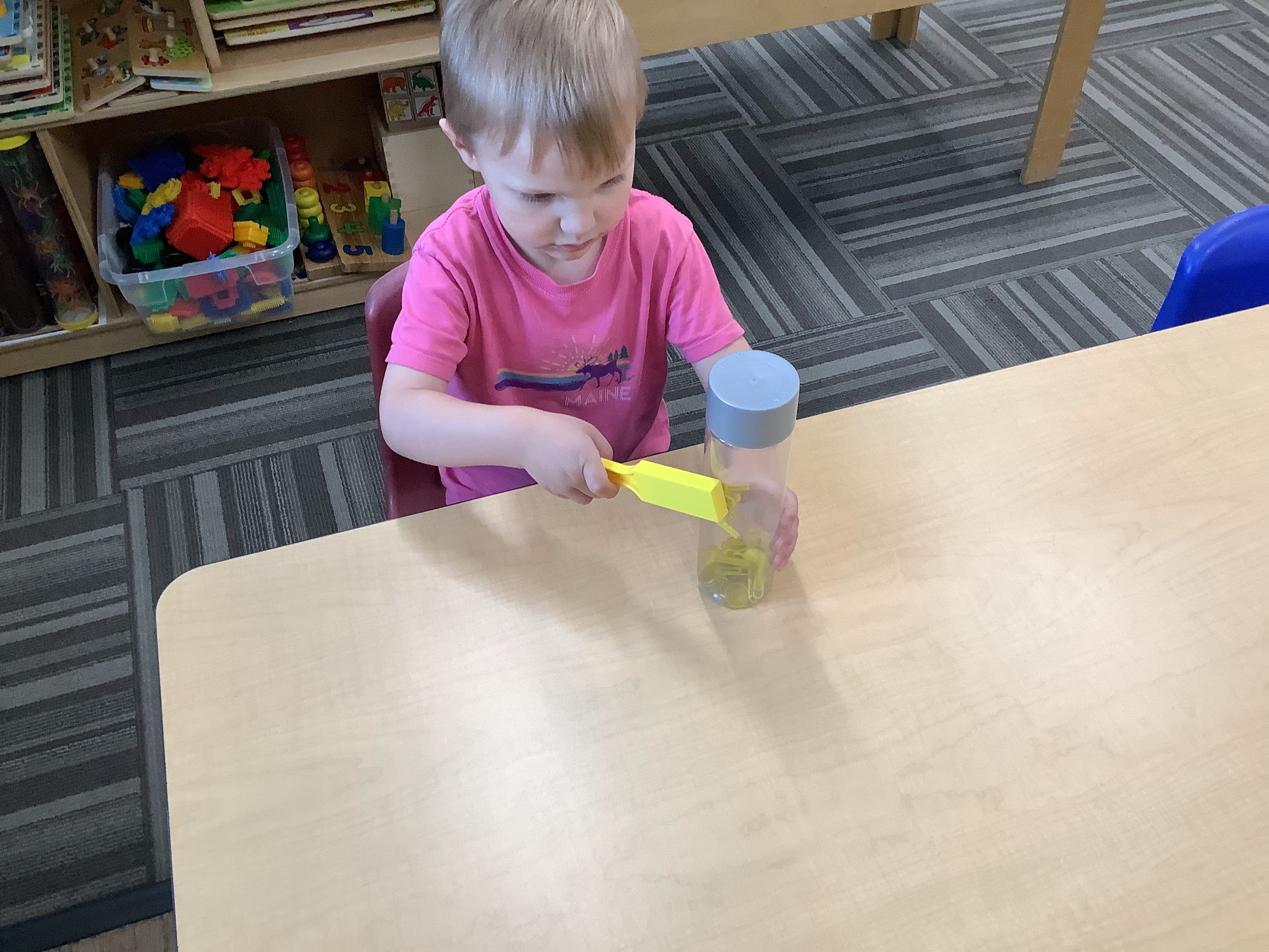 In the sensory table the kiddos will dig through green grass to find many different Easter related fun stuff.